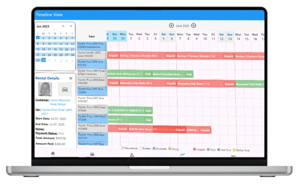 Use the side menu to quickly add a car, assign rentals, manage payments, or update customer details in seconds.